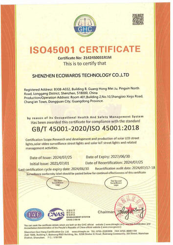 Certifies workplace safety standards, ensuring ethical production practices for high-quality solar lighting.